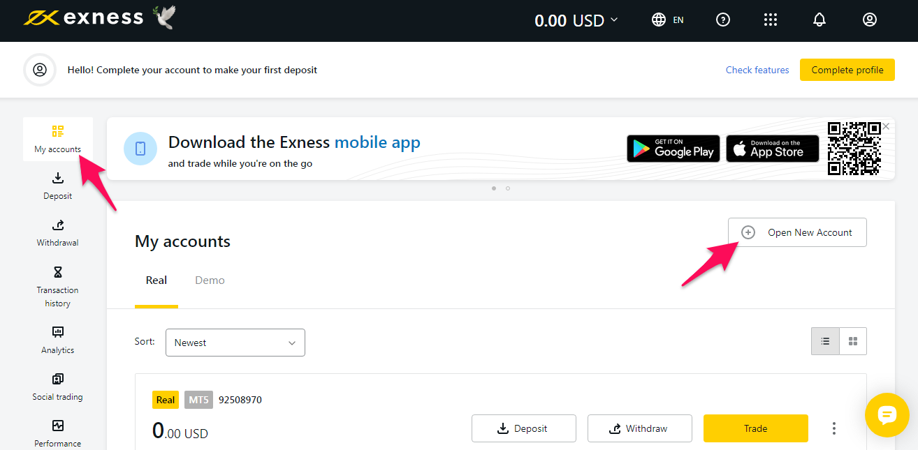 • از این قسمت می‌توانید حساب‌های معاملاتی ایجاد کنید، پلتفرم متاتریدر را دانلود کنید و به تنظیمات امنیتی حساب دسترسی داشته باشید.